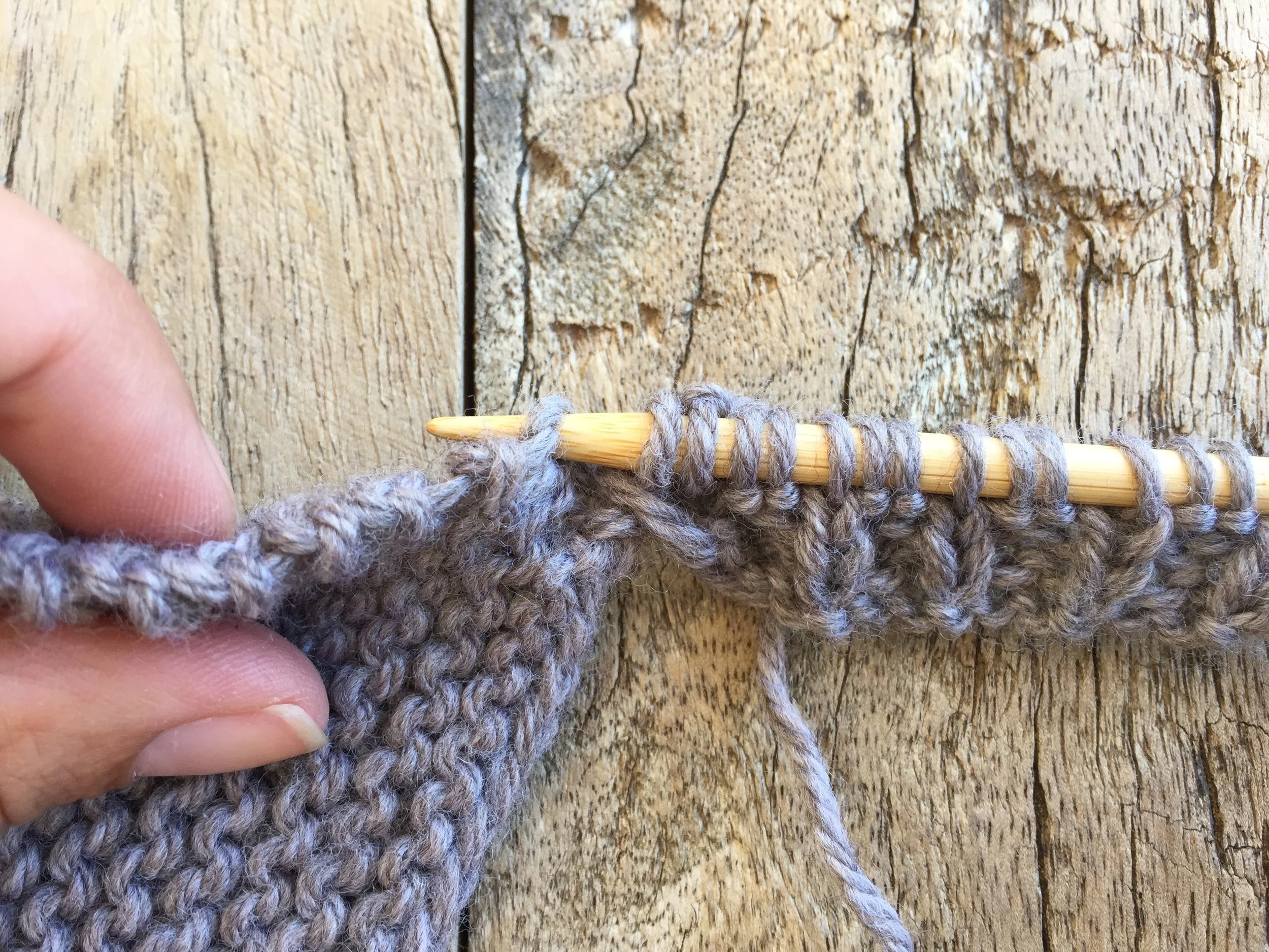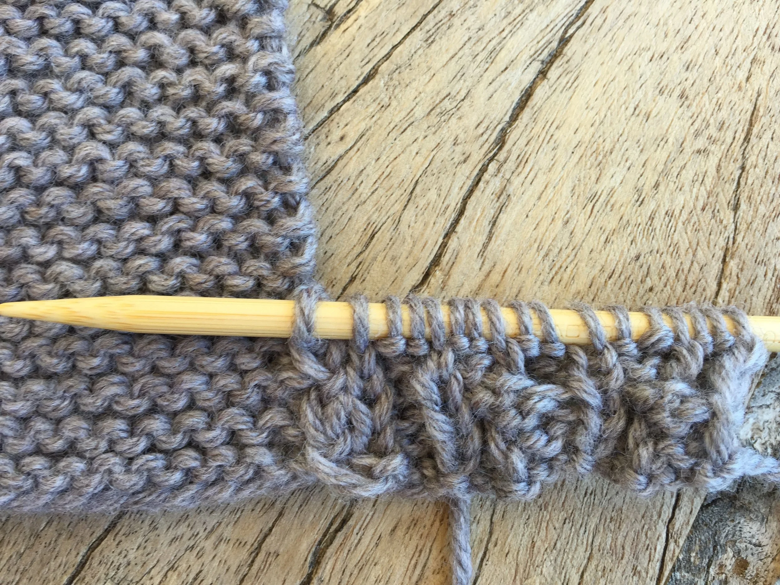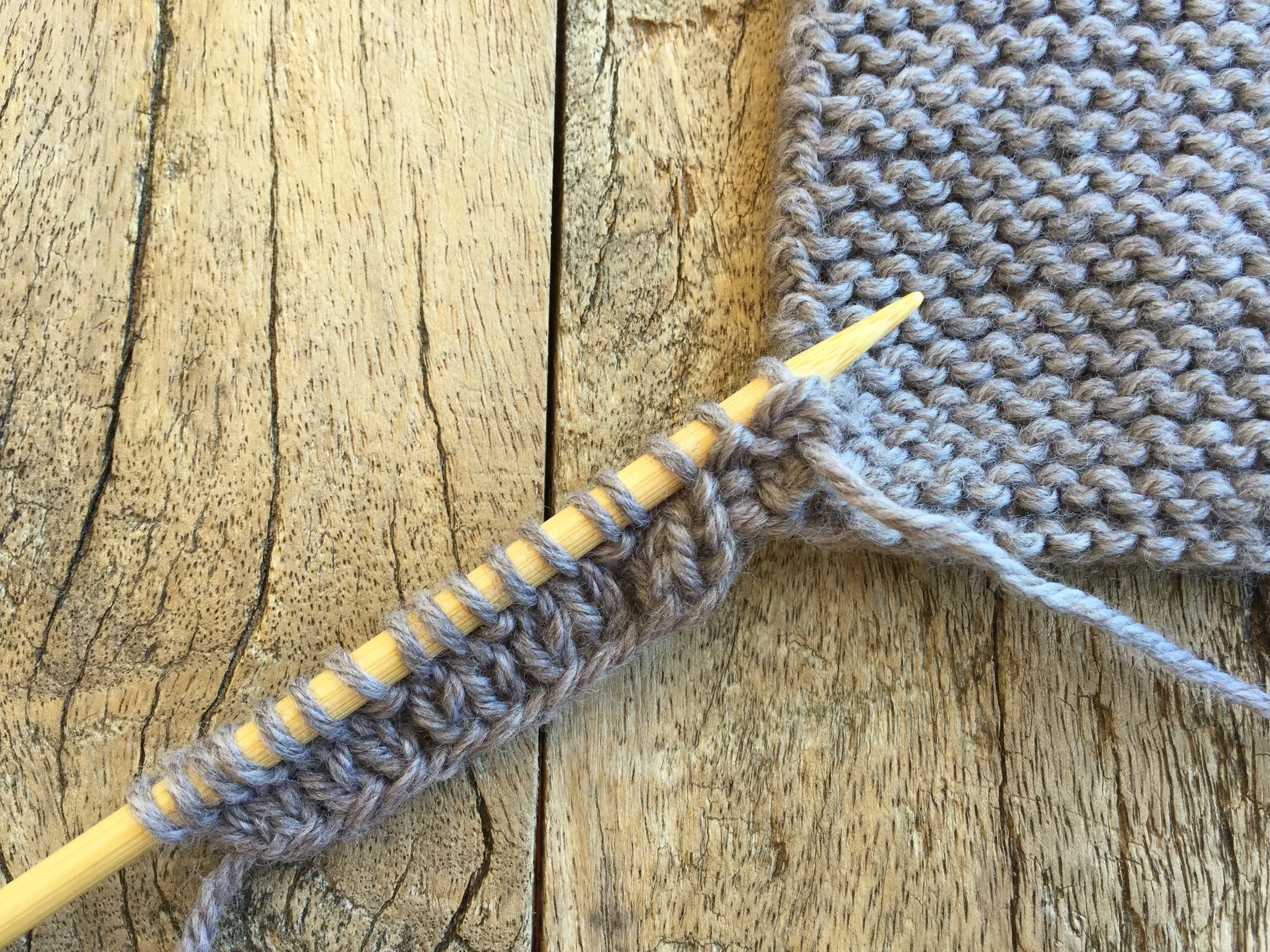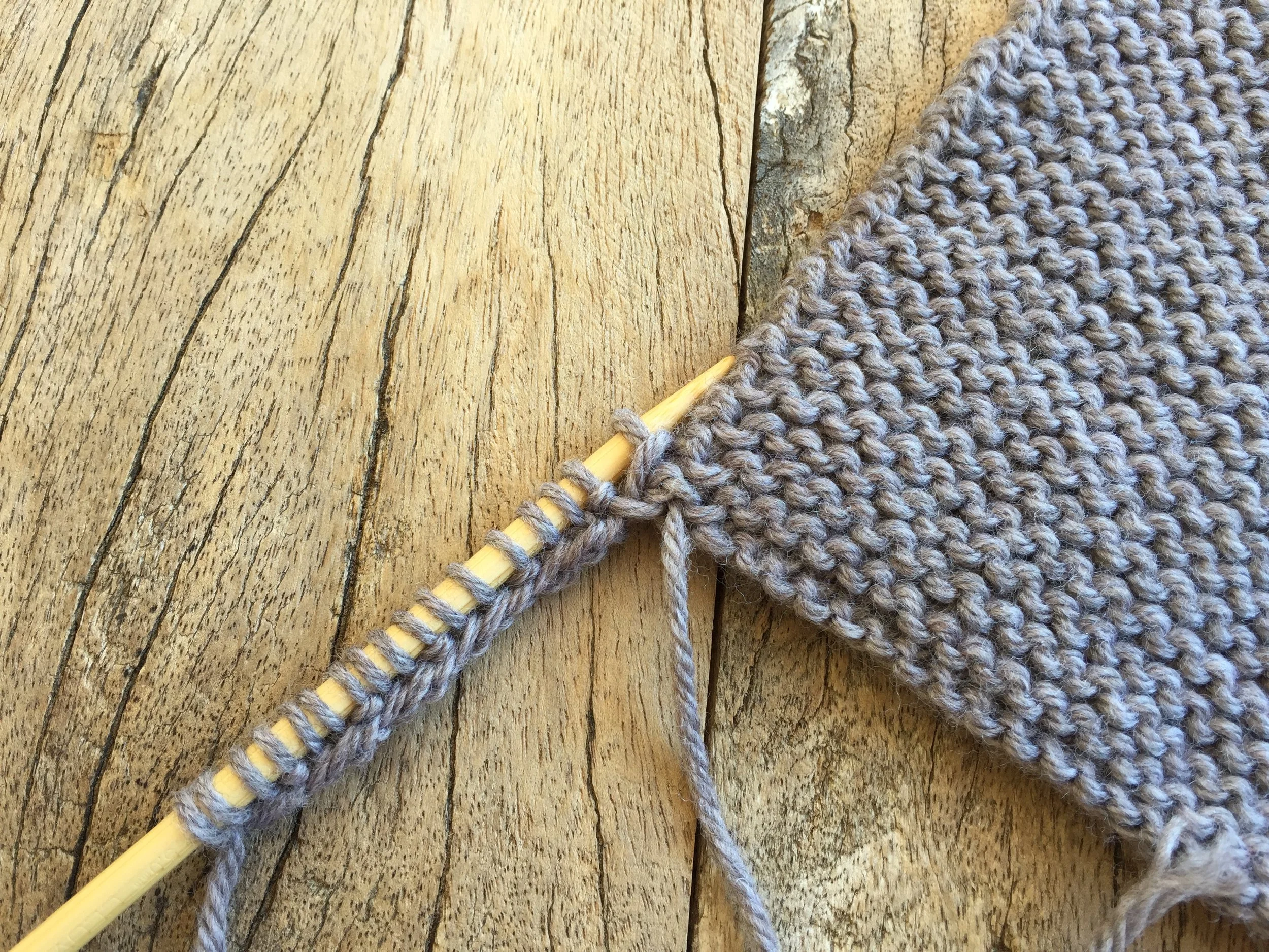 Then pick up a stitch through the bottom garter ridge as shown below.